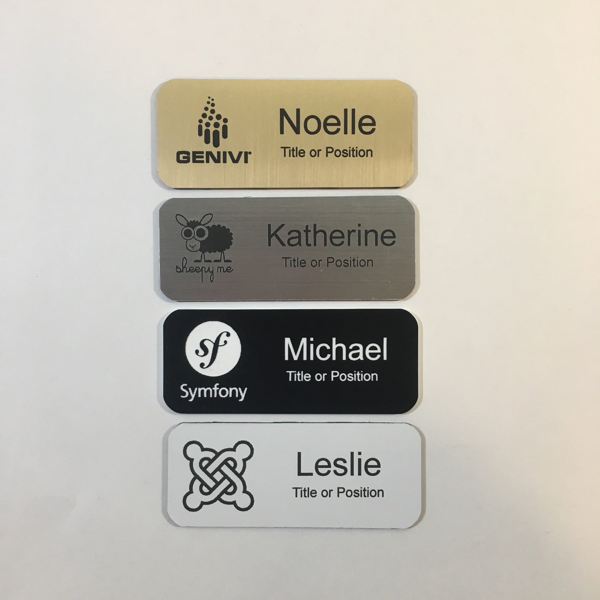 Set of Twelve (12) 1.25" x 3.0" Logo Name Badge Laser Engraved with Rounded Corners.